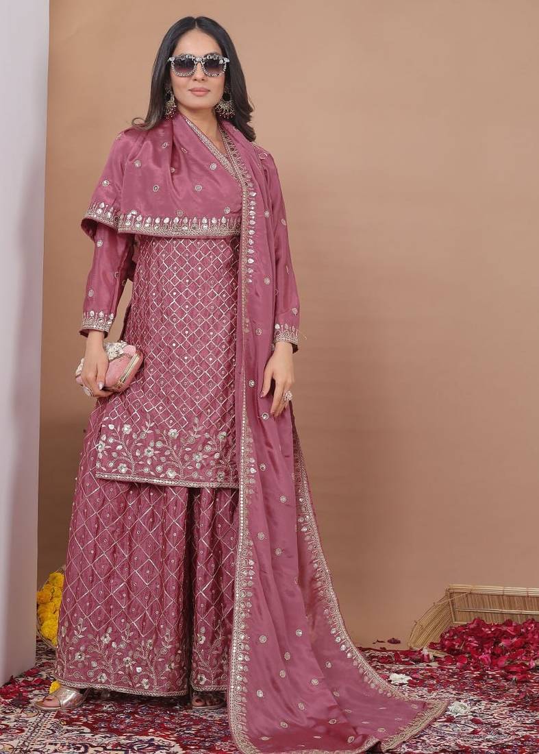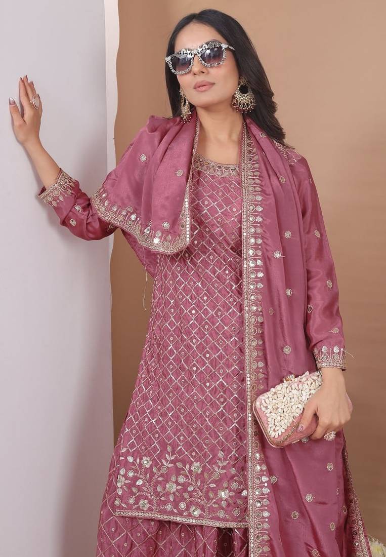 Dark onion color chinnon silk wedding wear trending plazo set stitched