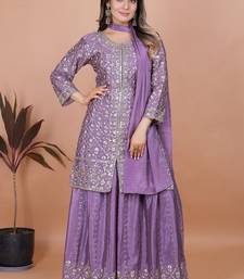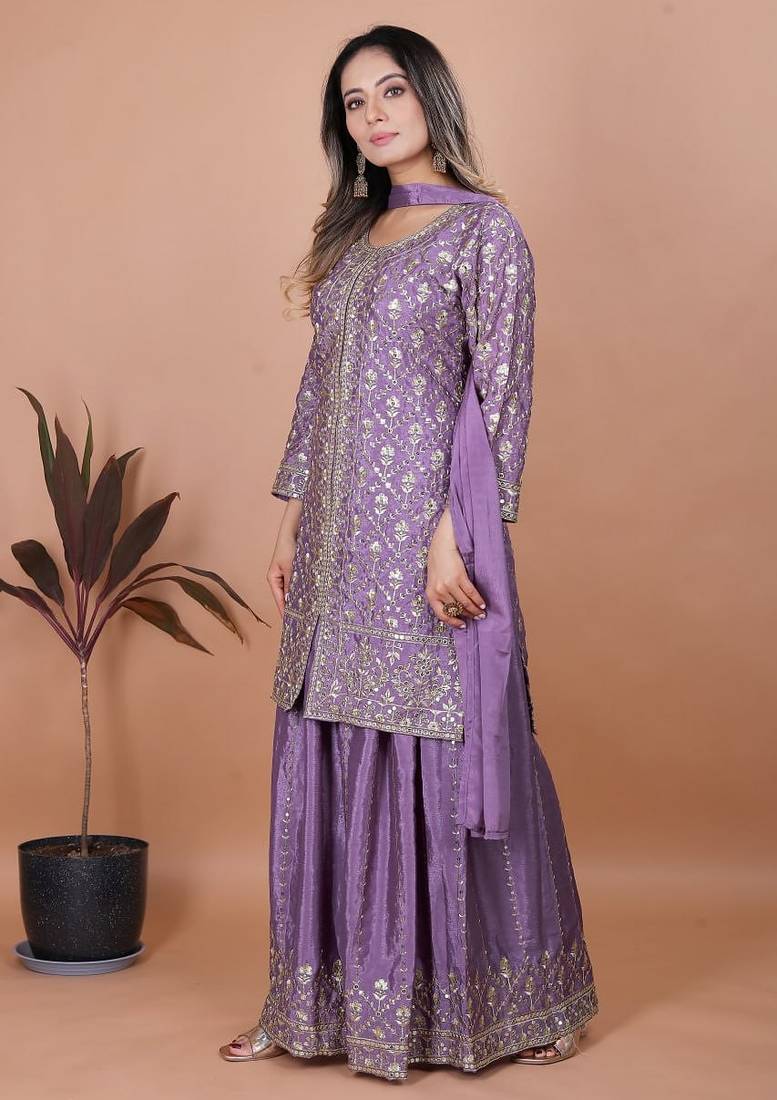 Lavender chinnon embroidery work party wear plazo suit stitched