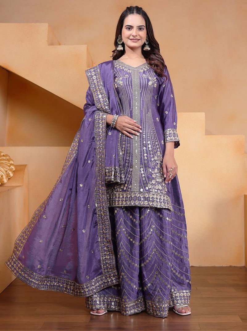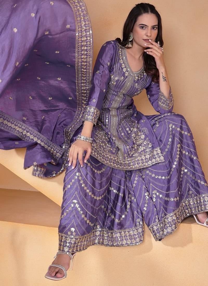 Lavender color chinnon silk wedding wear trending plazo set stitched