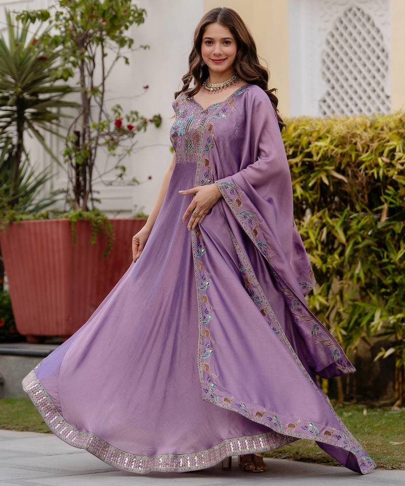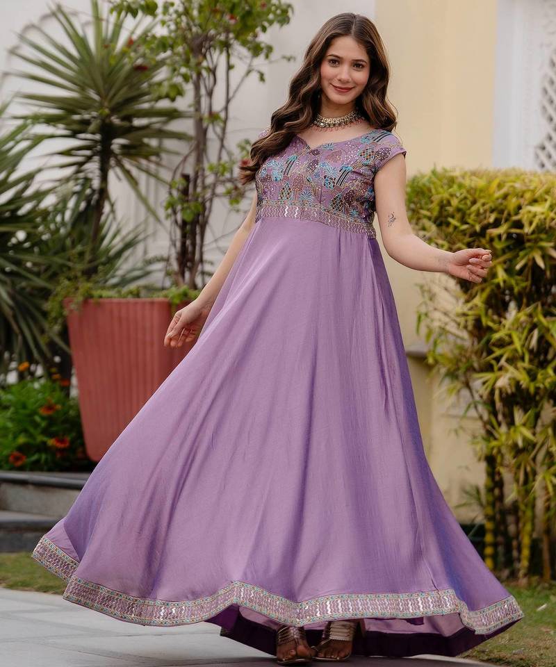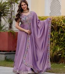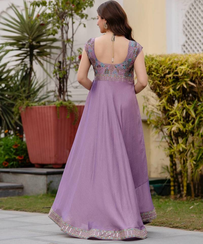 Lavender color vichitra silk designer party wear gown stitched