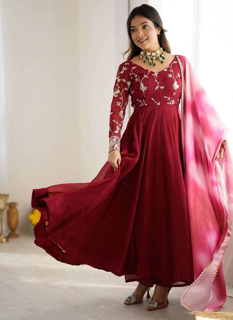 Maroon color crunchy silk embroidery work gown stitched