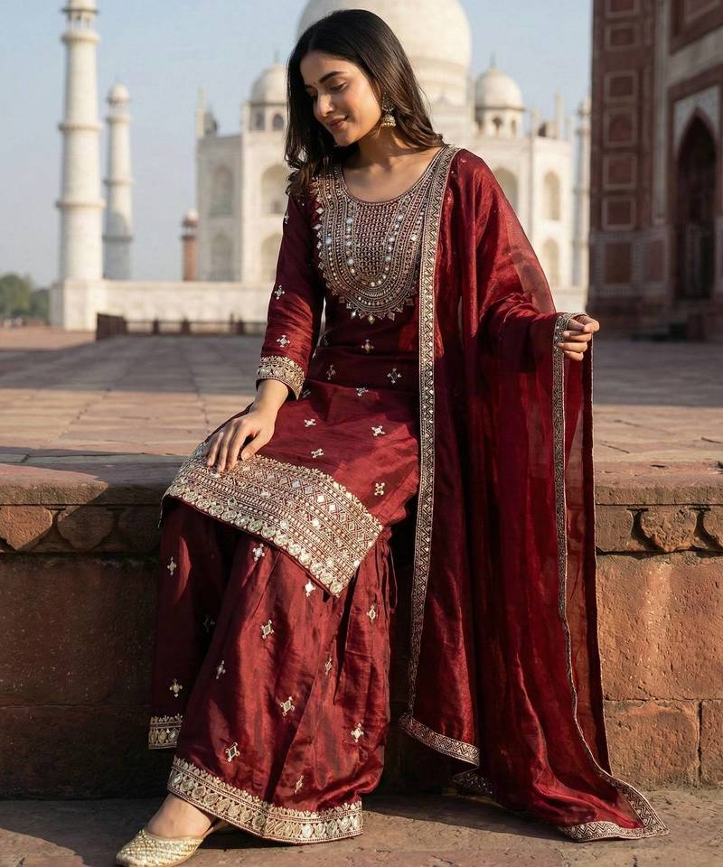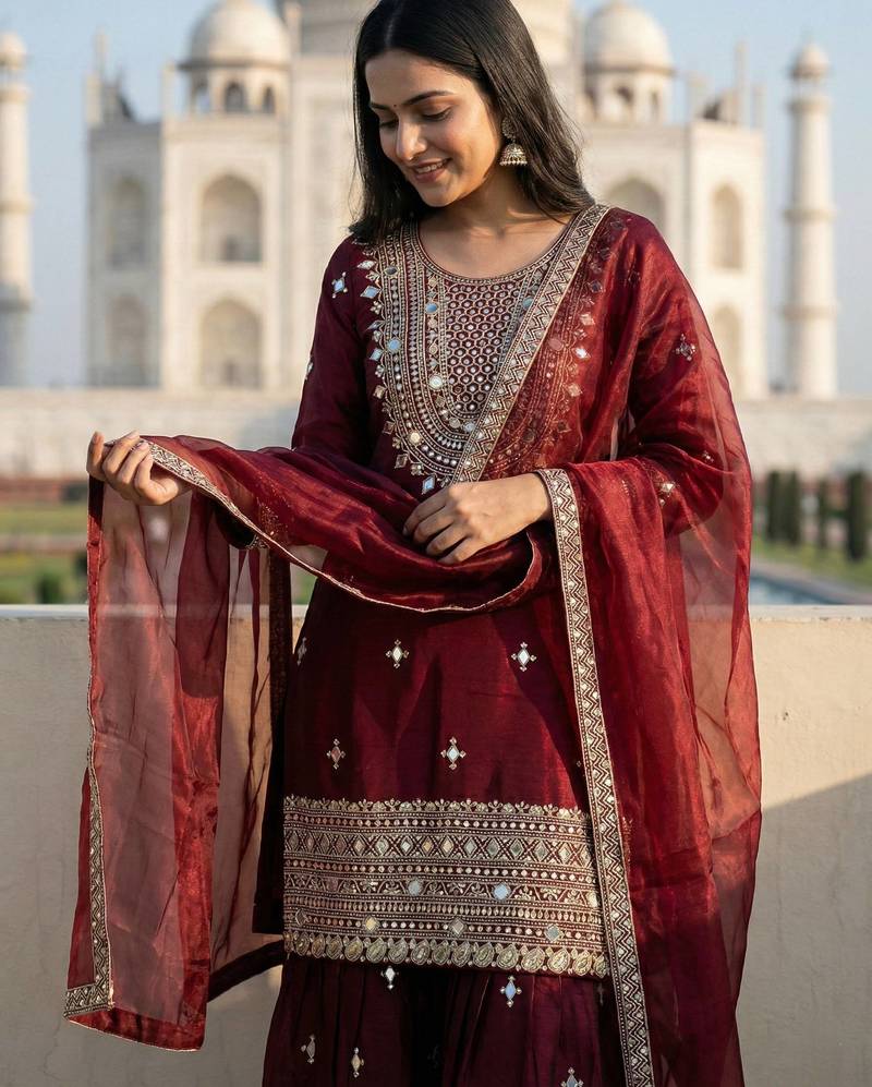 | Product Name | Maroon Color Gimmychu Silk Embroidery Work Wedding Wear Salwar Suit | |