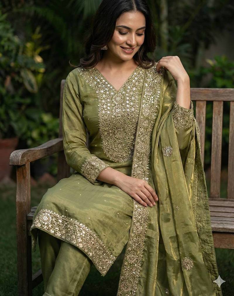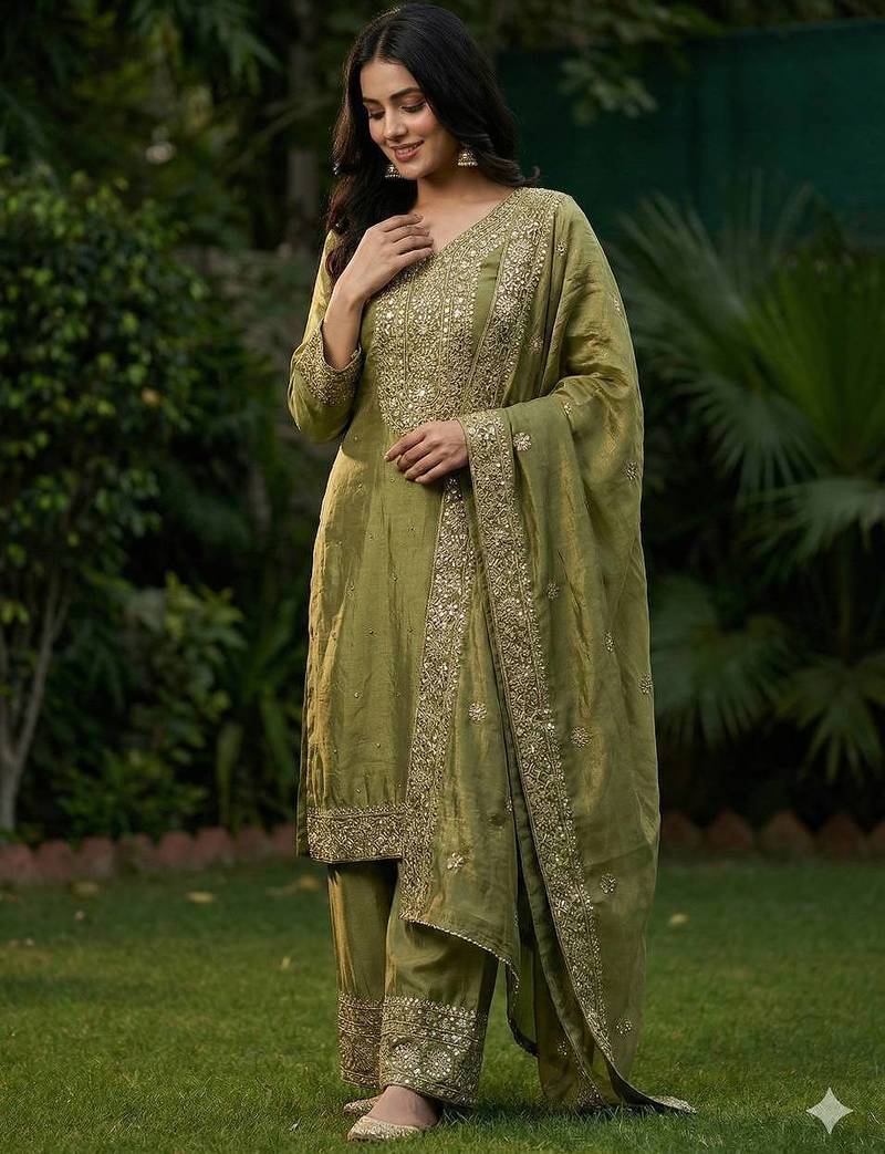 Mehendi color fendy silk embroidery work wedding wear salwar suit stitched