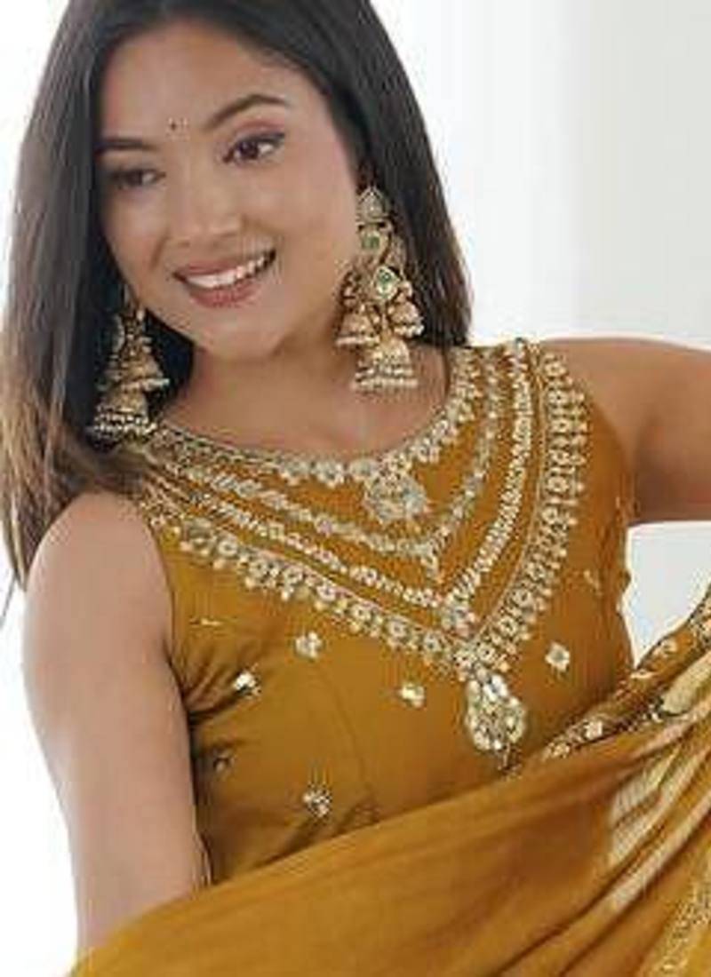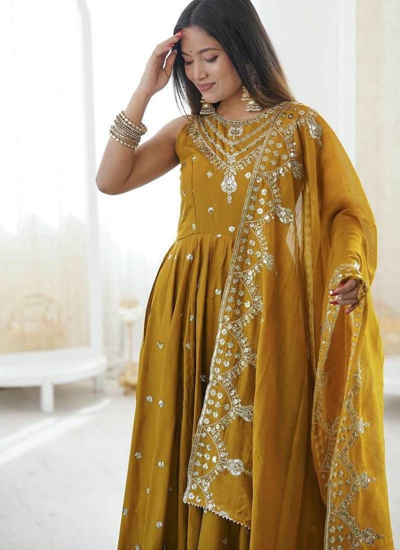 | Product Name | Musterd Color Roman Silk Embroidery Work Party Wear Gown | |