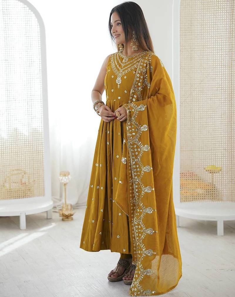Musterd color roman silk embroidery work party wear gown stitched