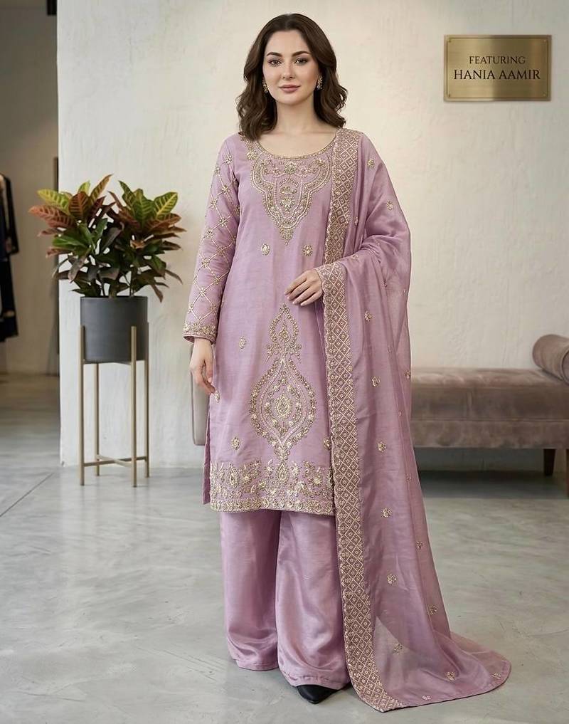 Product Name Onion Color Gimmychu Silk Embroidery Work Wedding Wear Salwar Suit