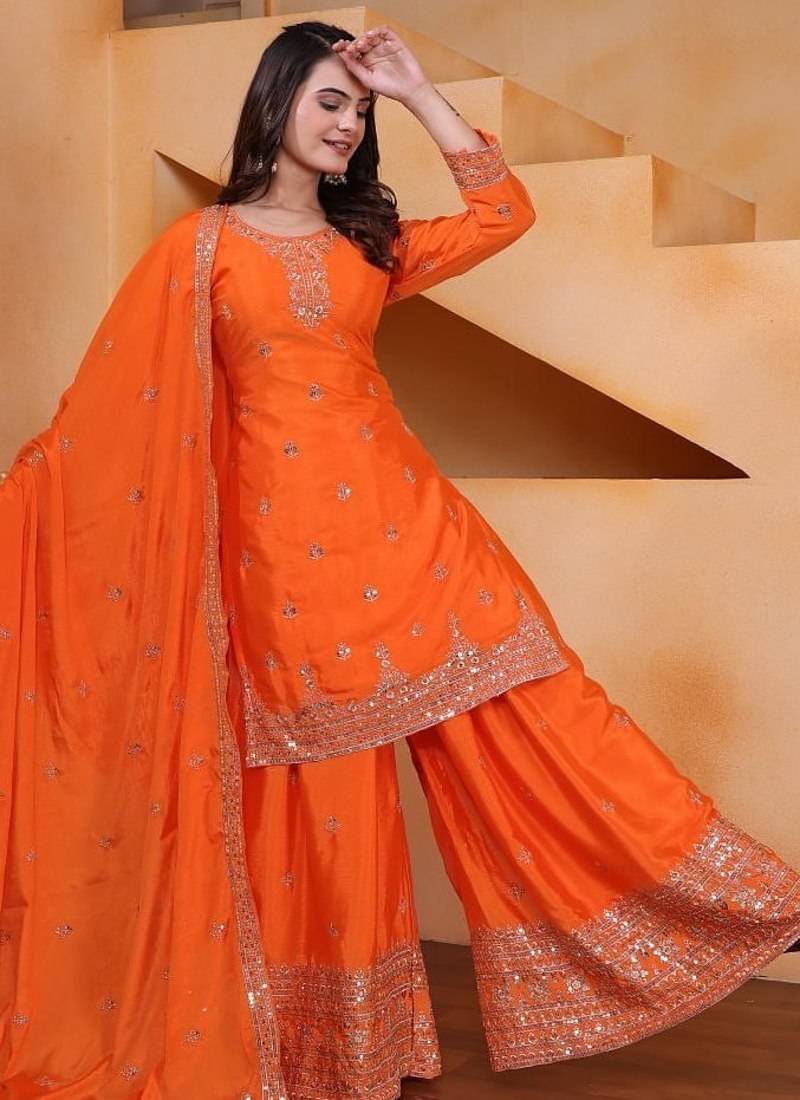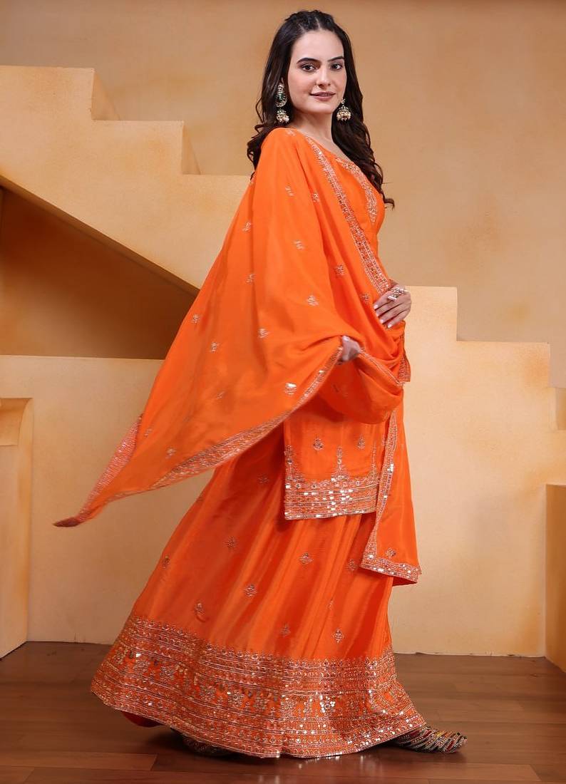 Orange color chinnon silk wedding wear trending plazo set stitched
