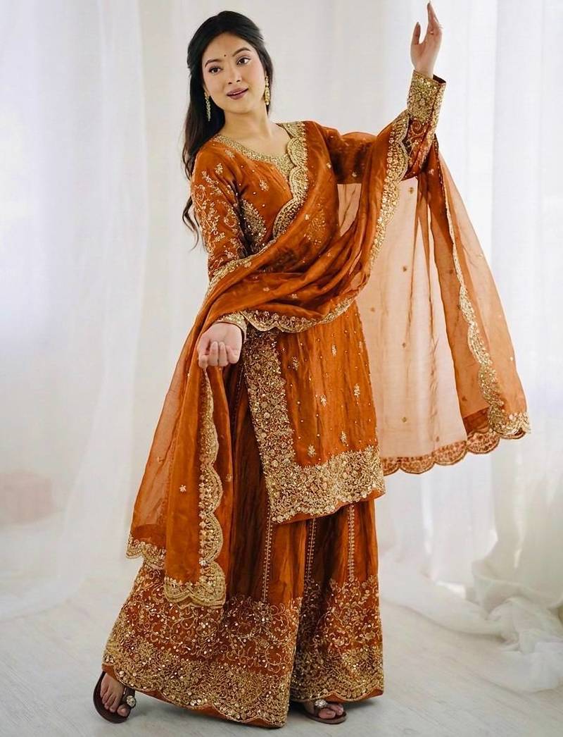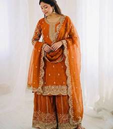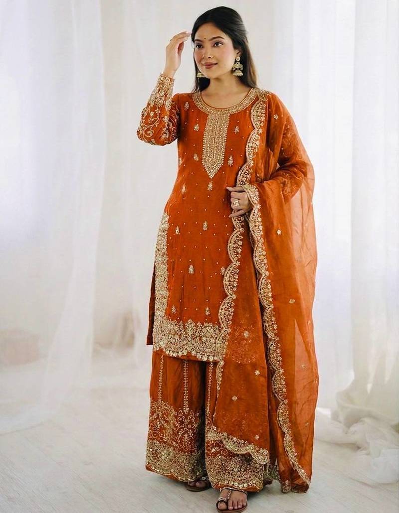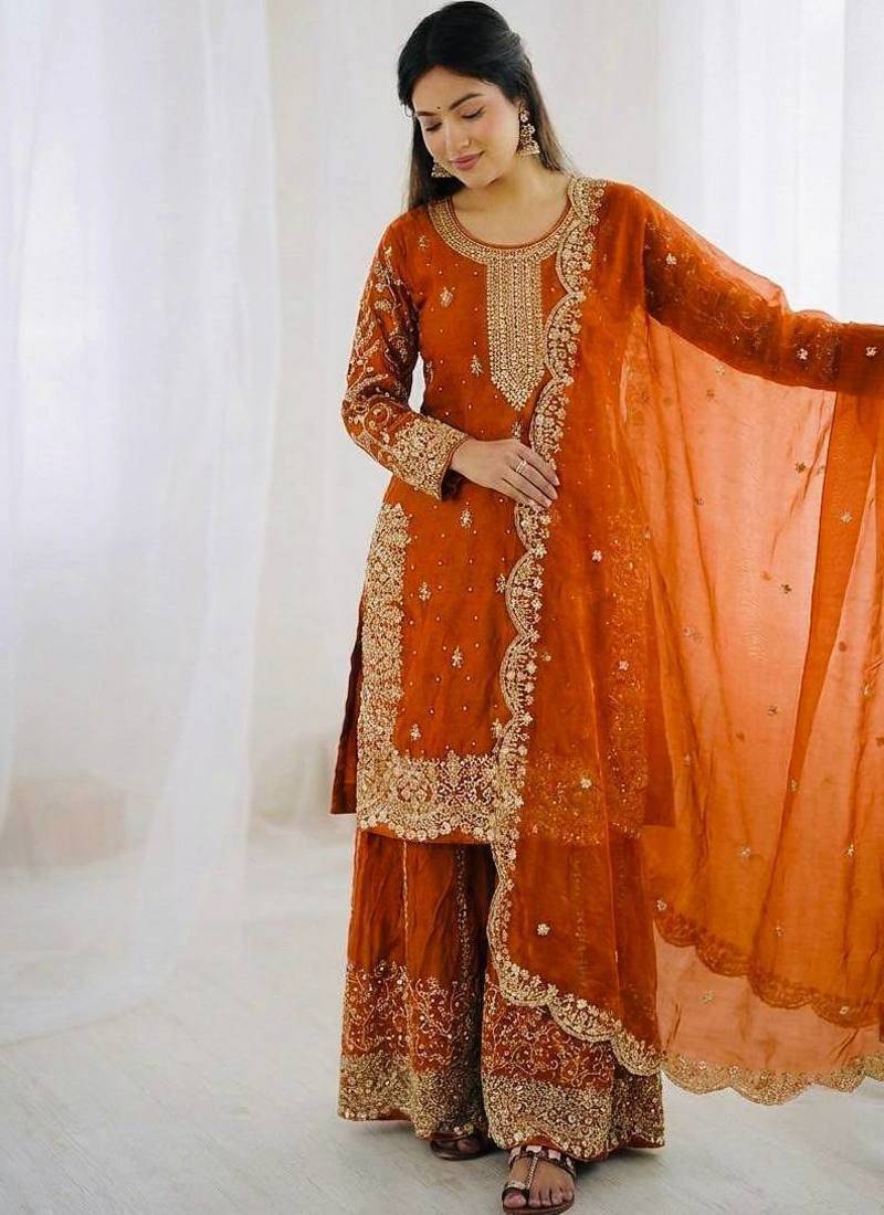 Orange color fendy silk embroidery work wedding wear salwar suit stitched