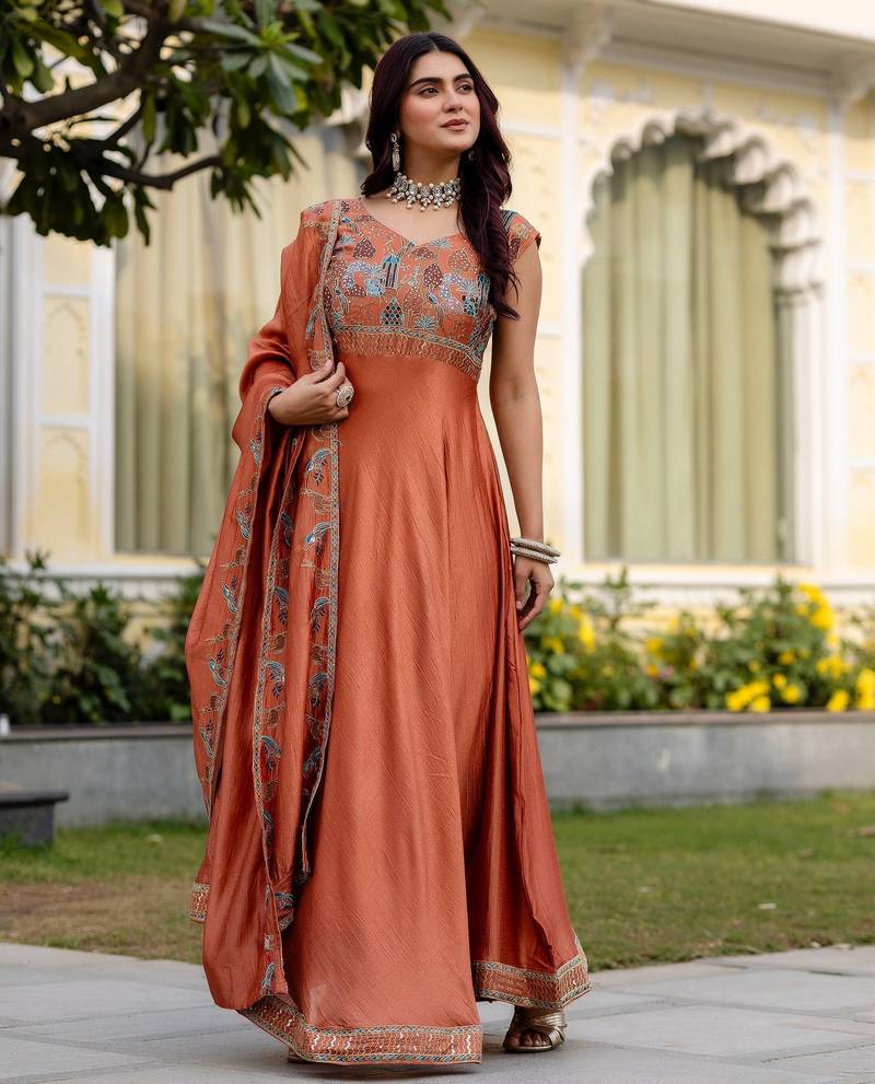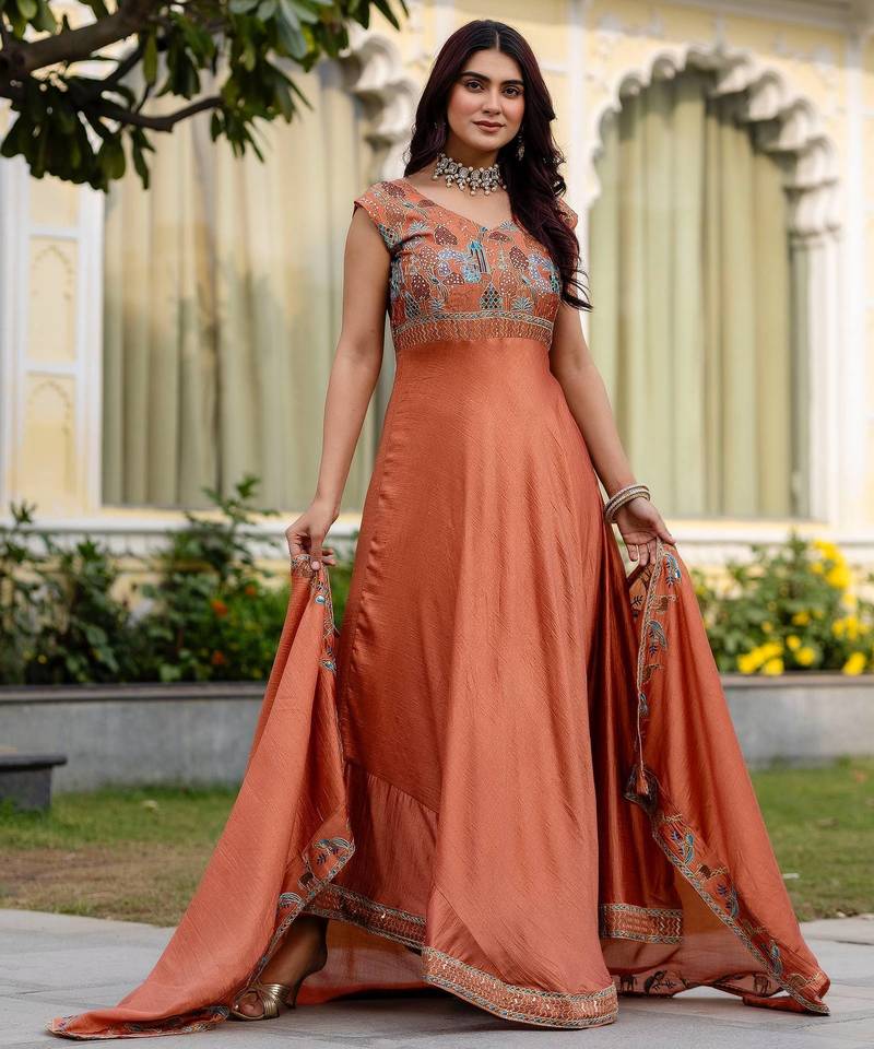 Orange color vichitra silk designer party wear long gown stitched