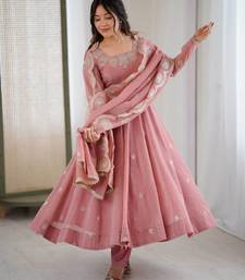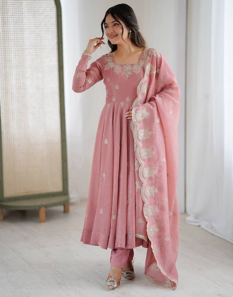 Peach color crunchy silk embroidery work wedding wear gown stitched