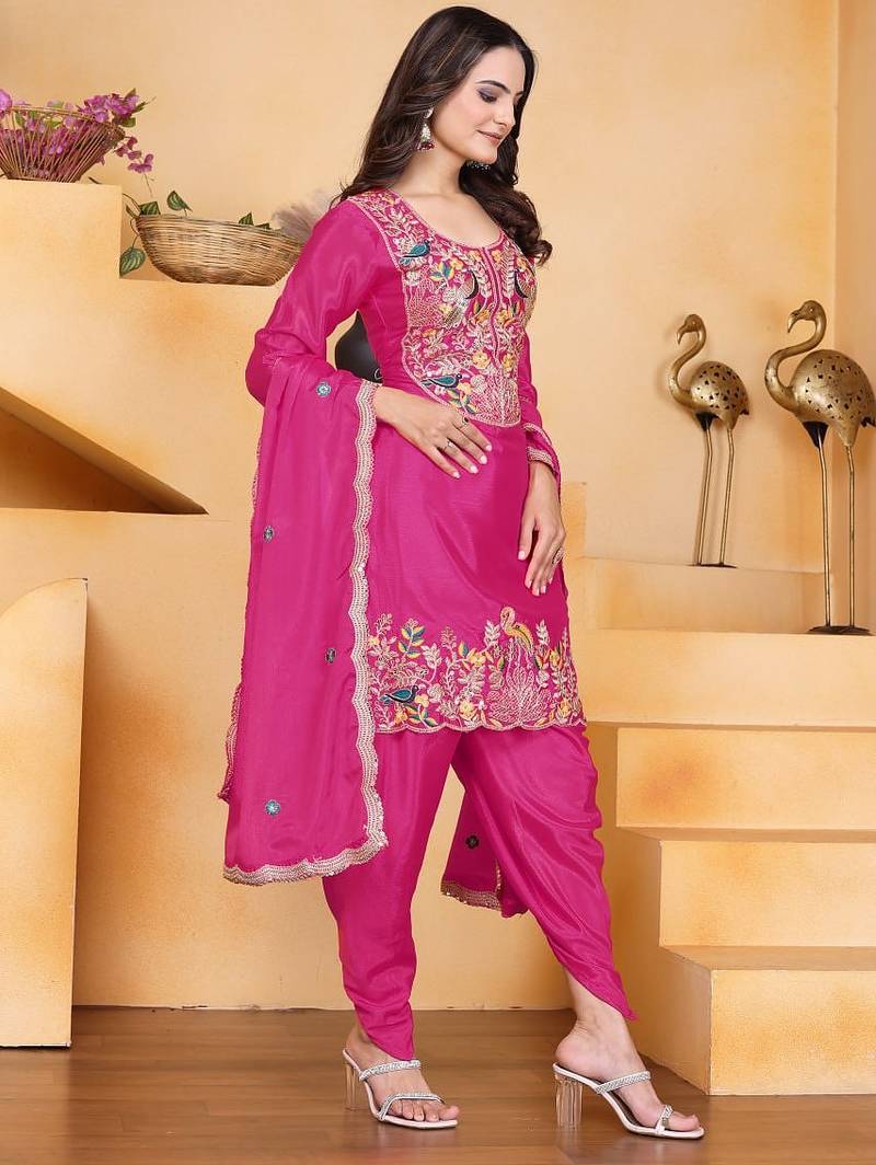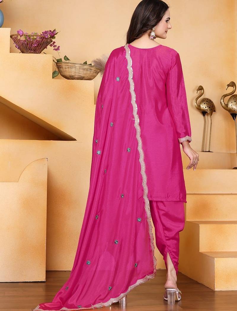 Pink color chinnon silk party wear punjabi dhoti suit stitched