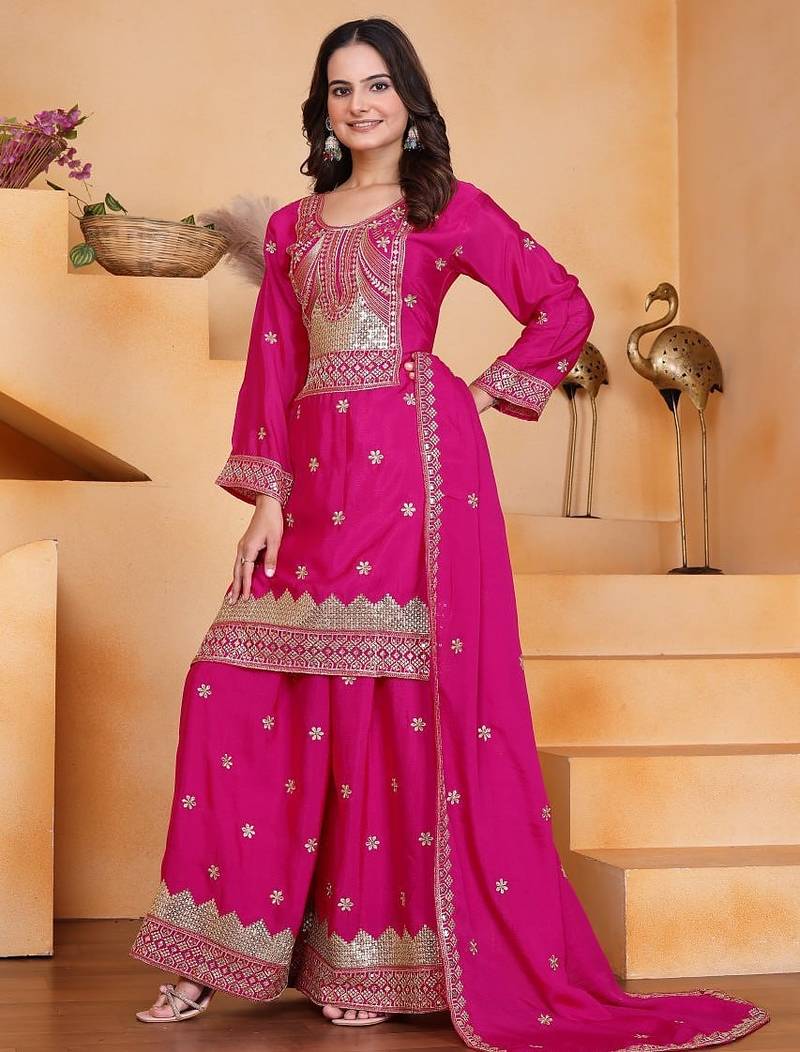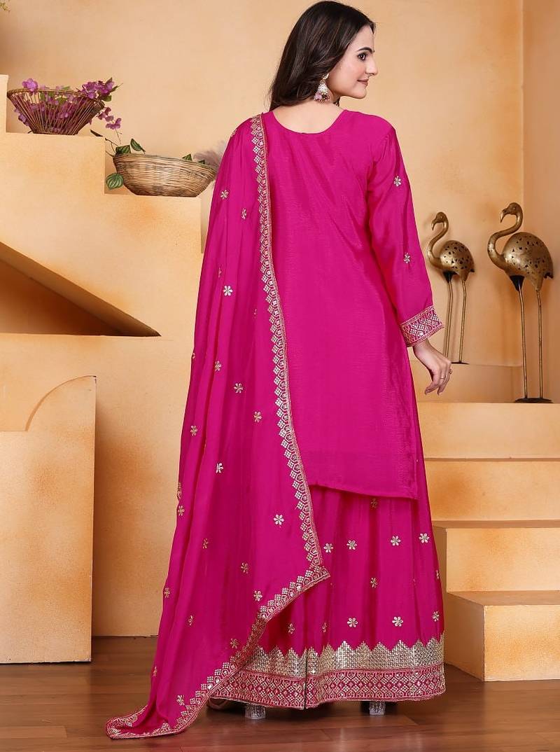 Pink color chinnon silk wedding wear trending plazo set stitched