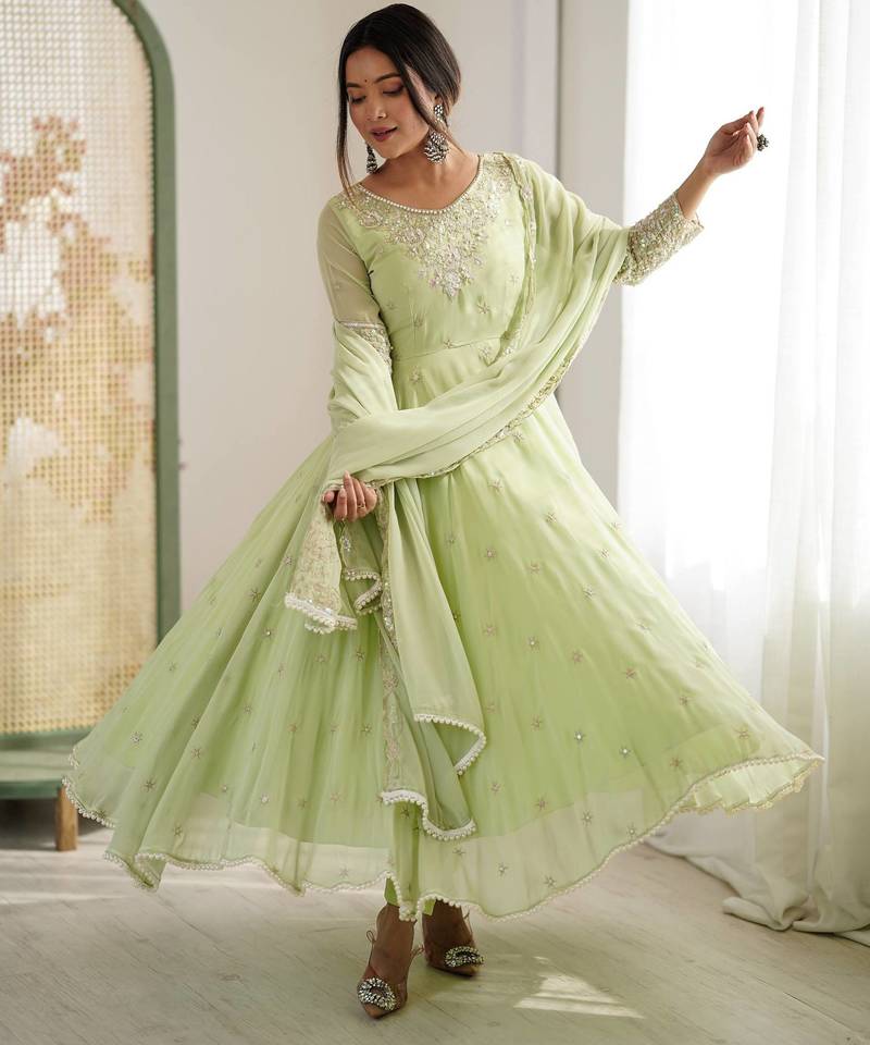 Pista color faux georgette embroidery work wedding wear gown stitched