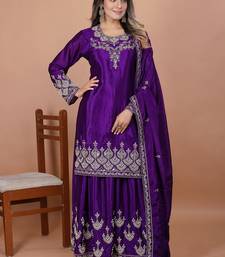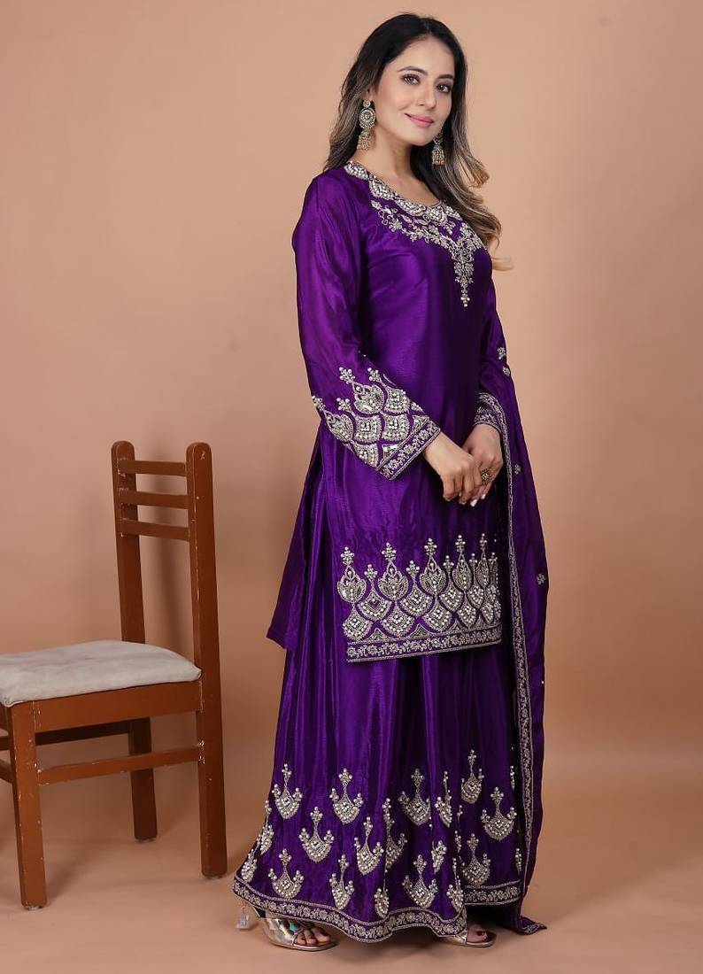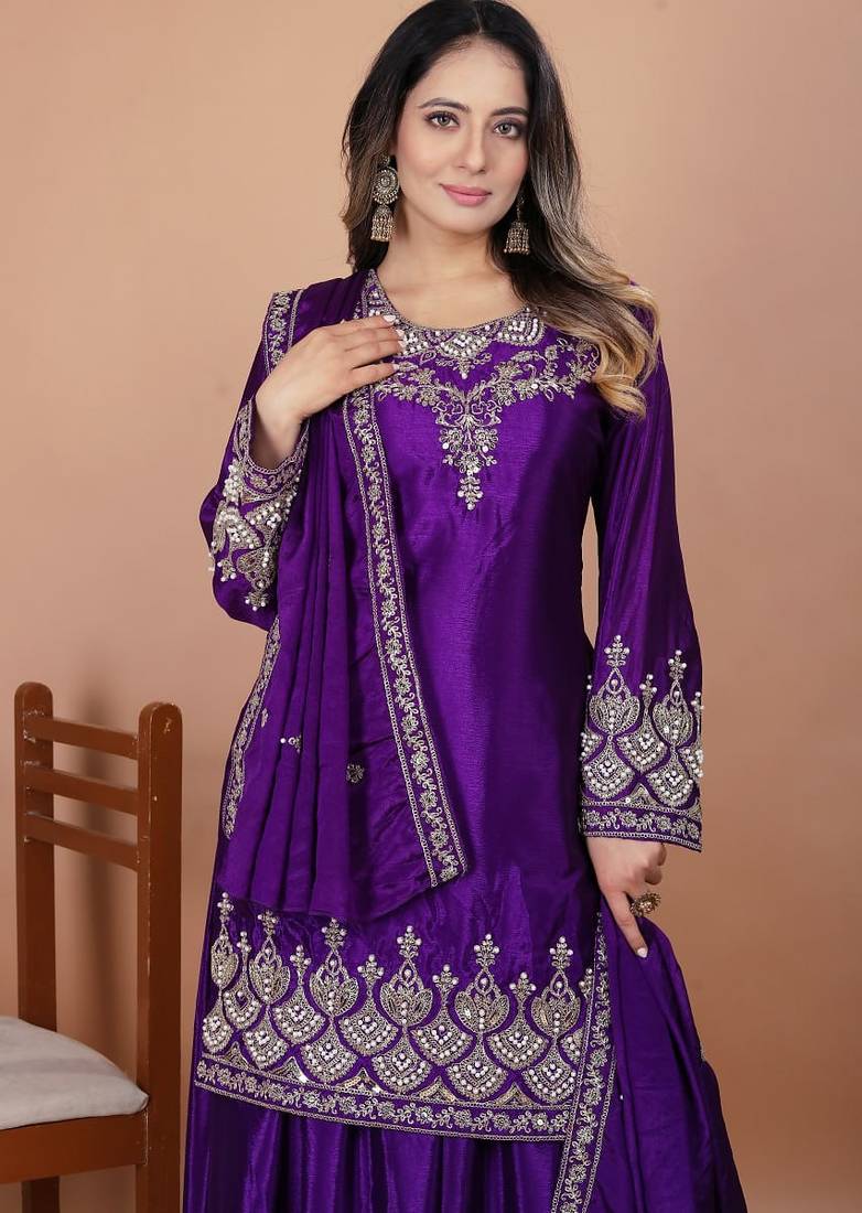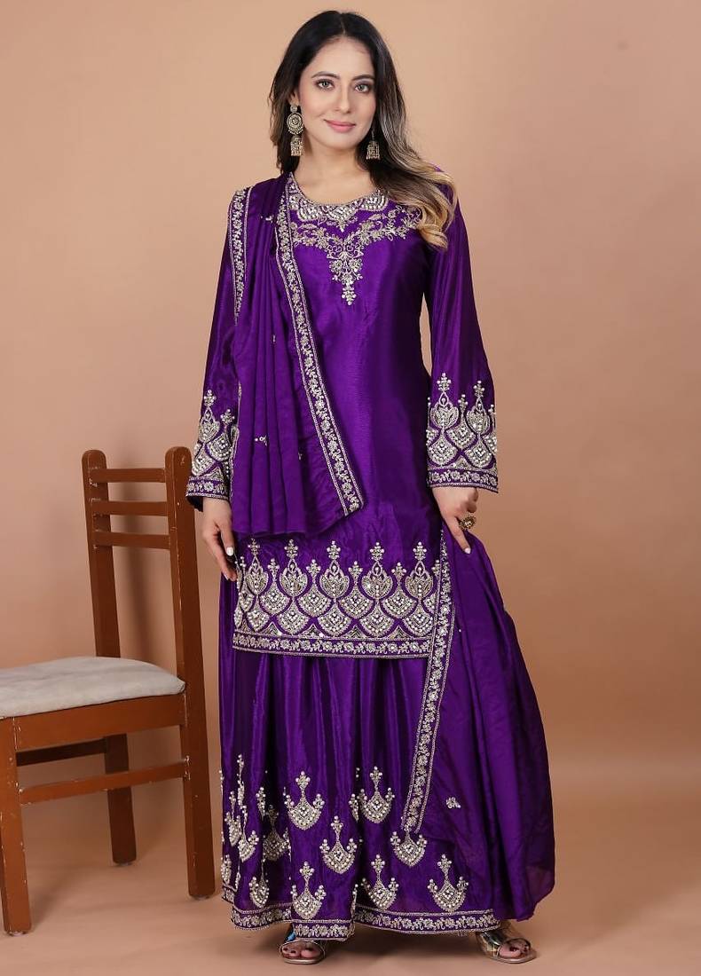 | Product Name | Purple Chinnon Embroidery Work Party Wear Plazo Suit | |