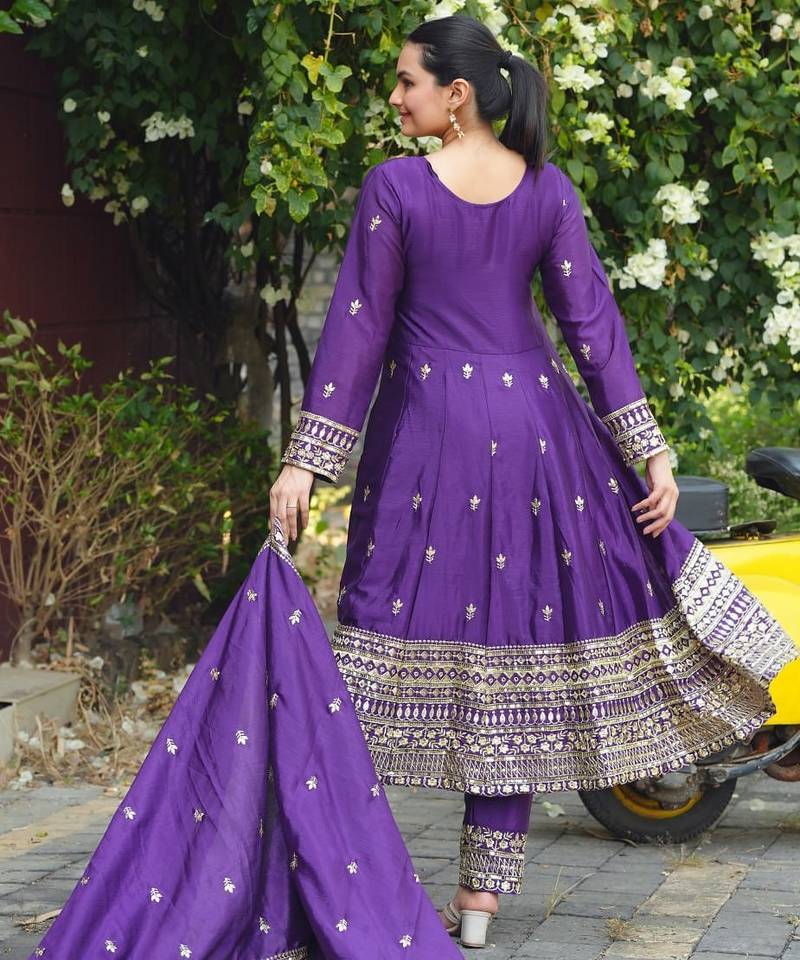 Purple color chinnon silk embroidery work long gown stitched