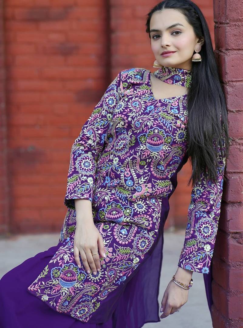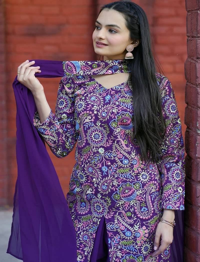Purple color tapeta silk embroidery work party wear plazo set stitched