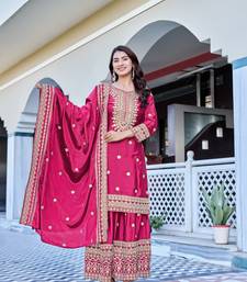 Rani color chinnon silk embroidery work wedding wear sharara stitched