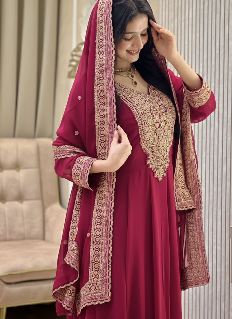 | • | Kameez | : | Color- Rani Pink / Fabric- Faux Georgette |