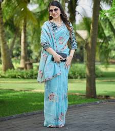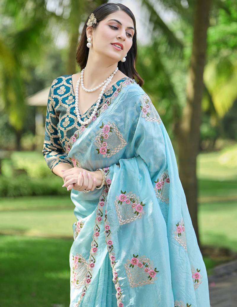 Sky color pure papel silk heavy embroidery work wedding wear saree