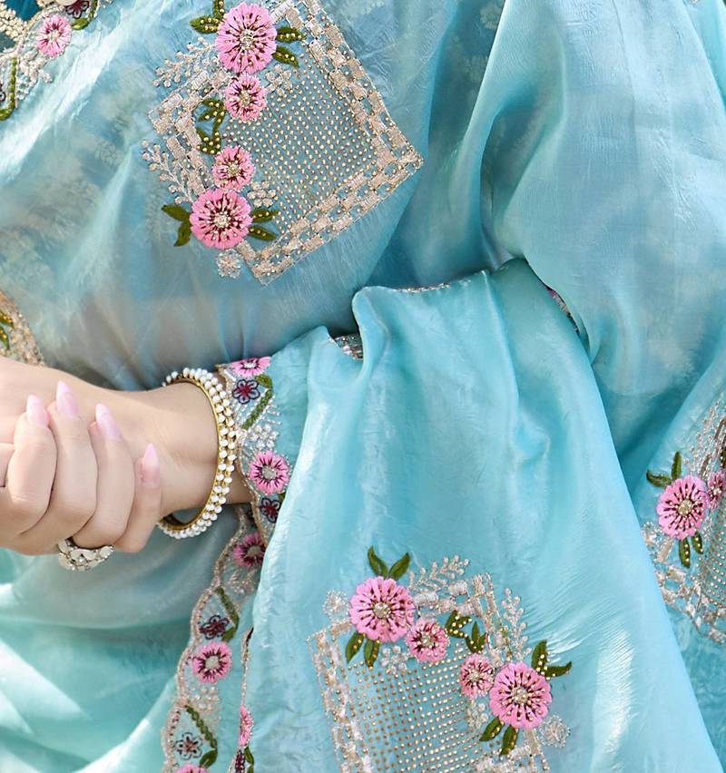 | Product Name | Sky Color Pure Papel Silk Heavy Embroidery Work Wedding Wear Saree | |