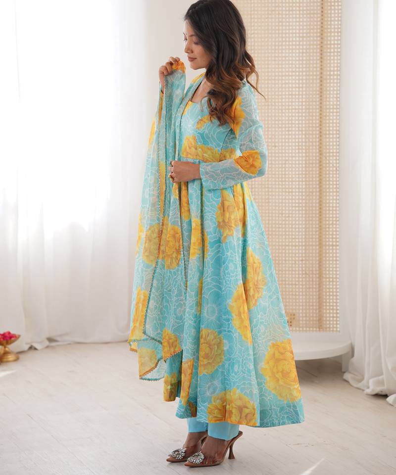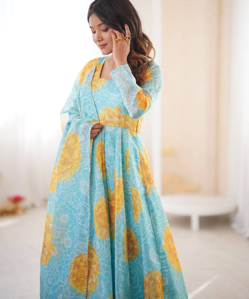 | Product Name | Sky Color Soft Organza Silk Digital Printed Party Wear Gown | |