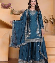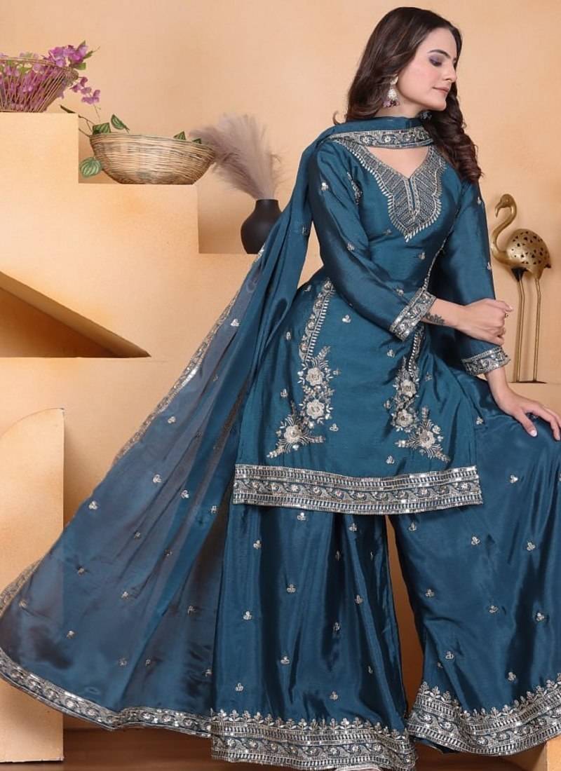 Teal color chinnon silk wedding wear trending plazo set stitched