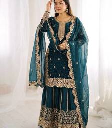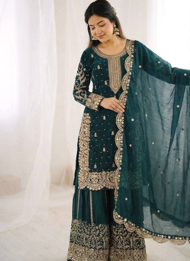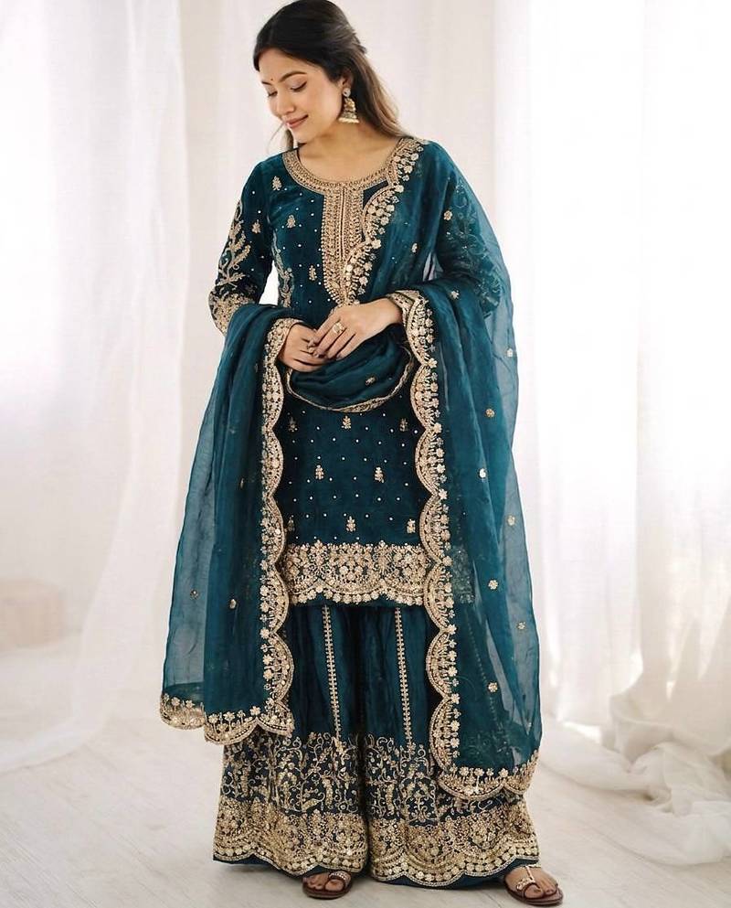 Teal color fendy silk embroidery work wedding wear salwar suit stitched