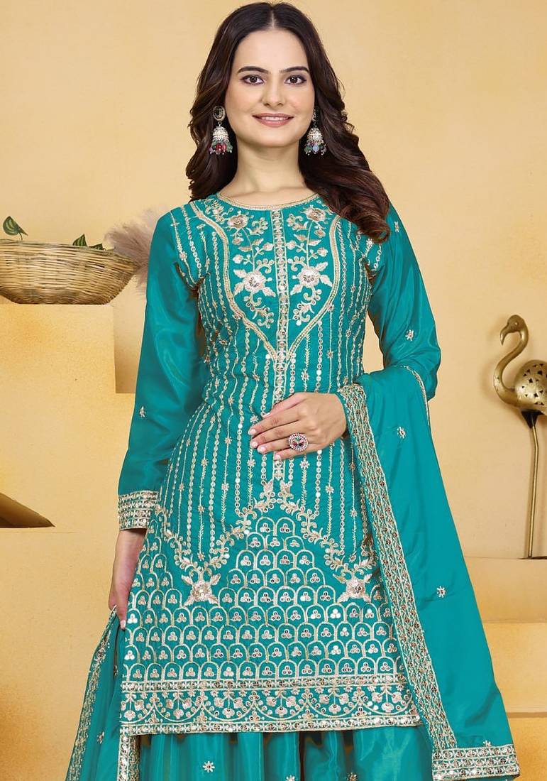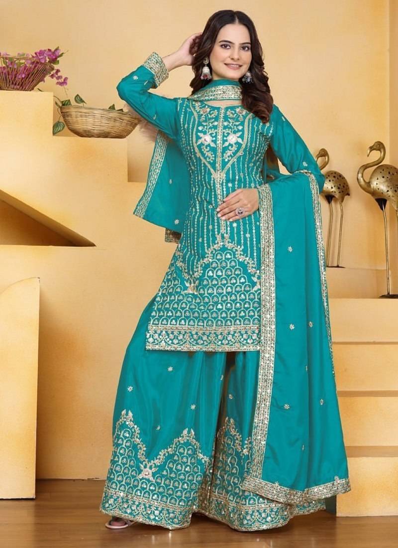 | Product Name | Teal Color Natural Creap Silk Wedding Wear Trending Plazo Set | |