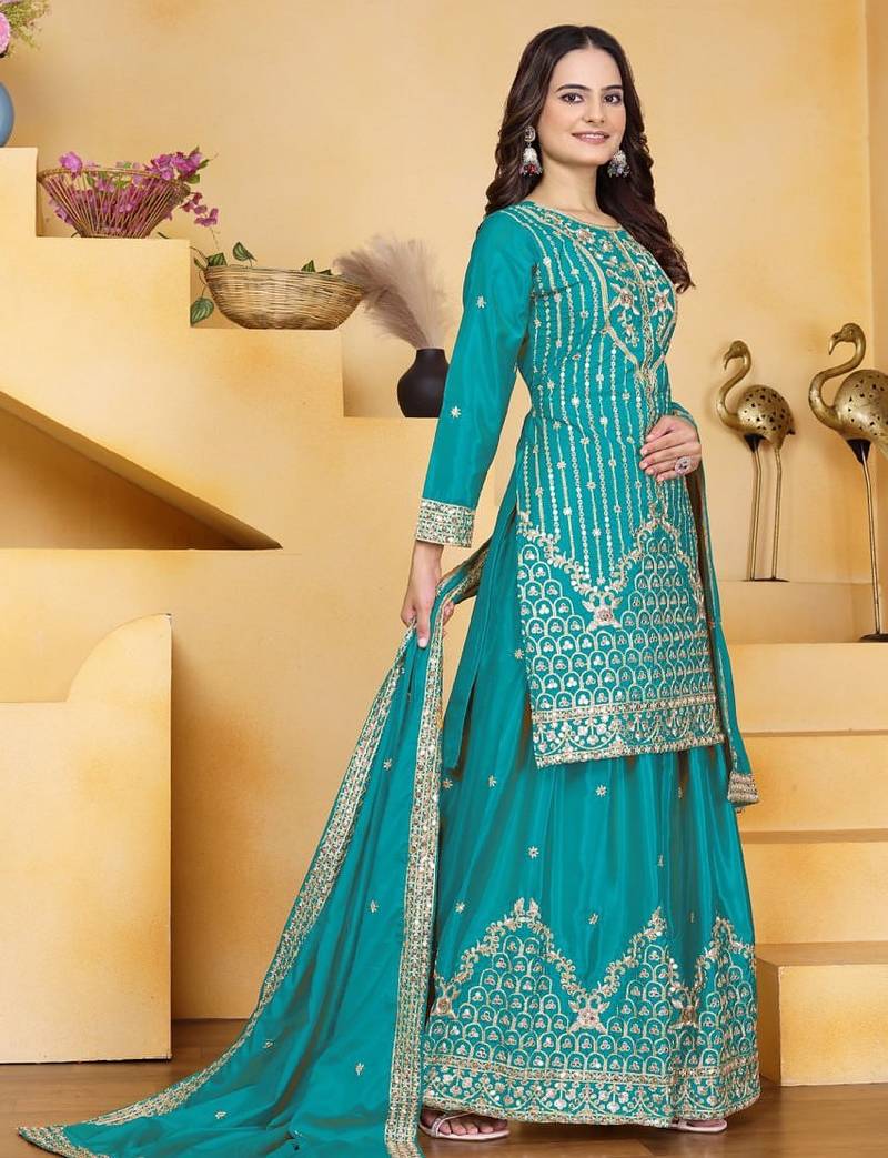 Teal color natural creap silk wedding wear trending plazo set stitched