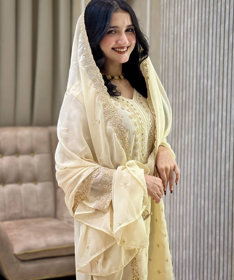 | • | Dupatta | : | Color- White / Fabric- Faux Georgette |