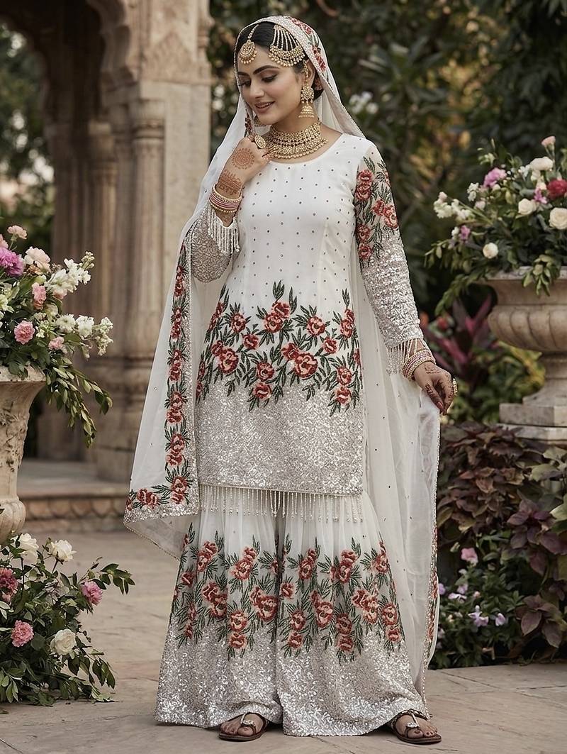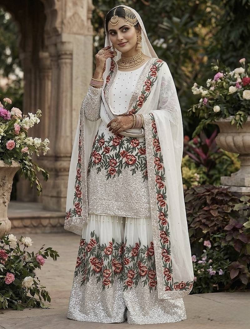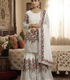 White fendy silk heavy embroidery work party wear sharara suit stitched