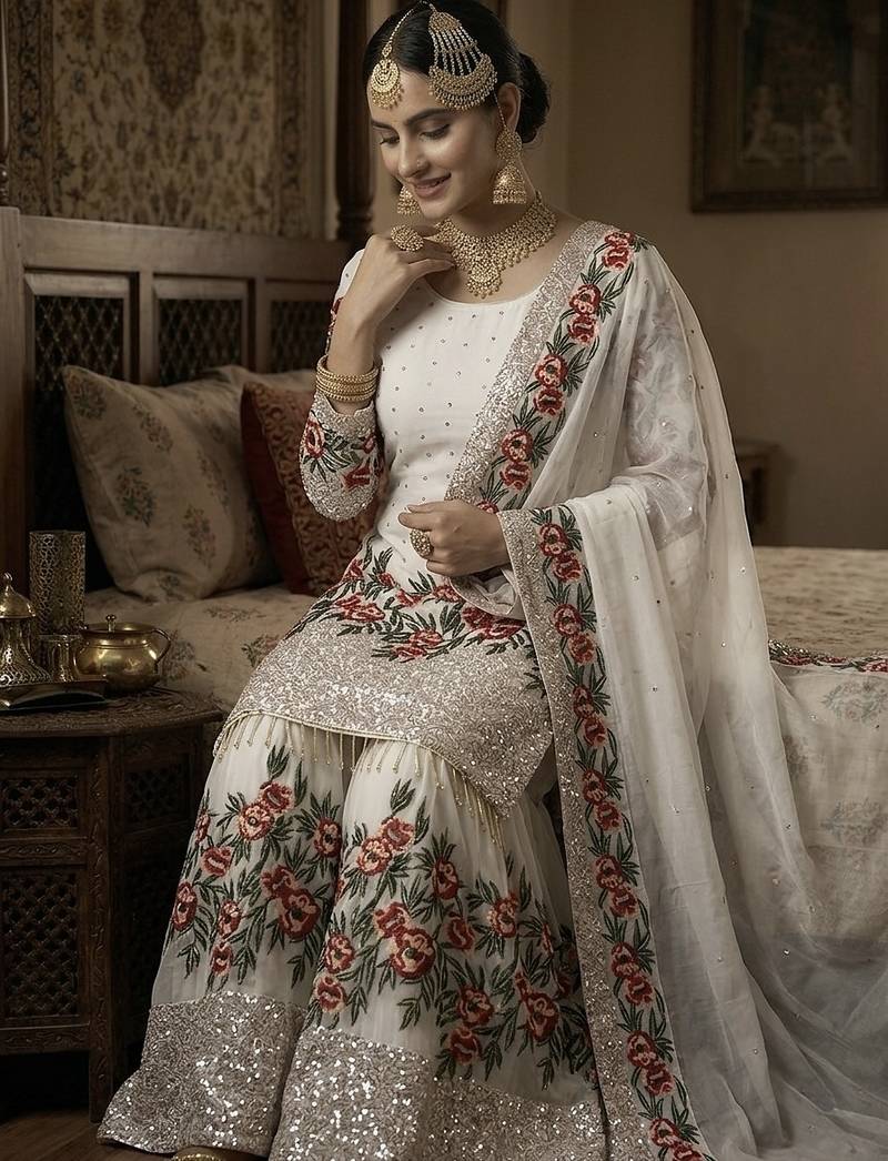 | Product Name | White Fendy Silk Heavy Embroidery Work Party Wear Sharara Suit | |