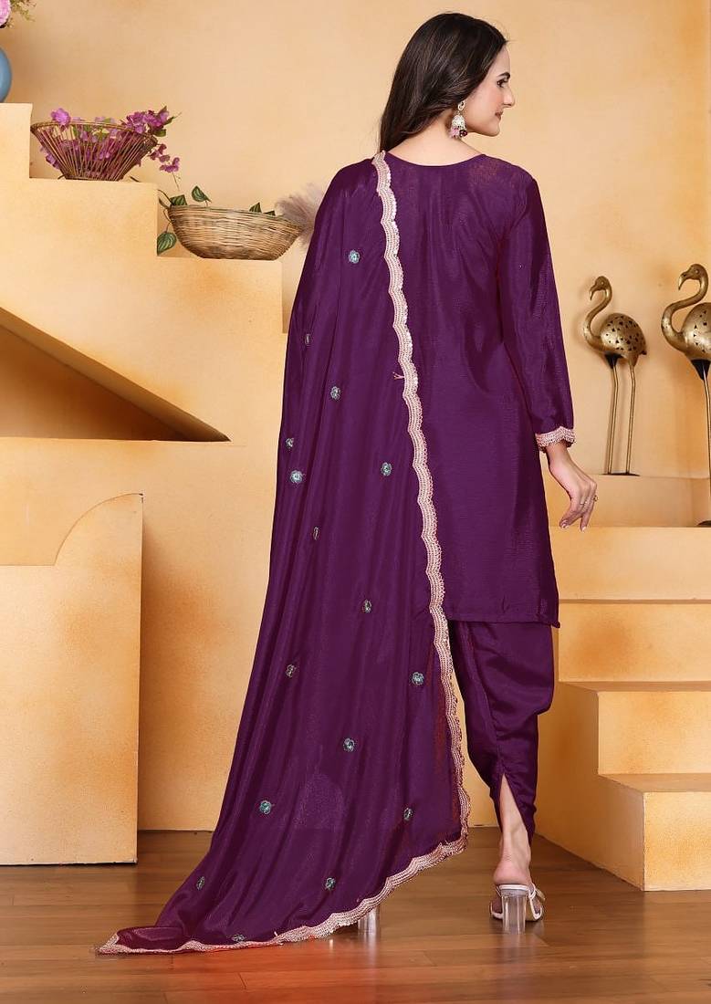 Wine color chinnon silk party wear punjabi dhoti suit stitched