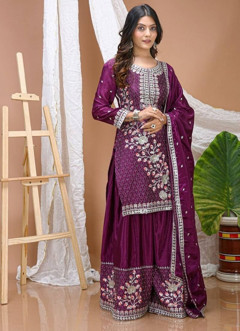 Wine color chinnon silk wedding wear trending plazo set stitched