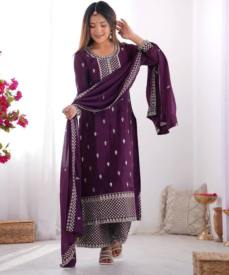 Wine color pure chinnon silk embroidery work functional wear salwar suit stitched