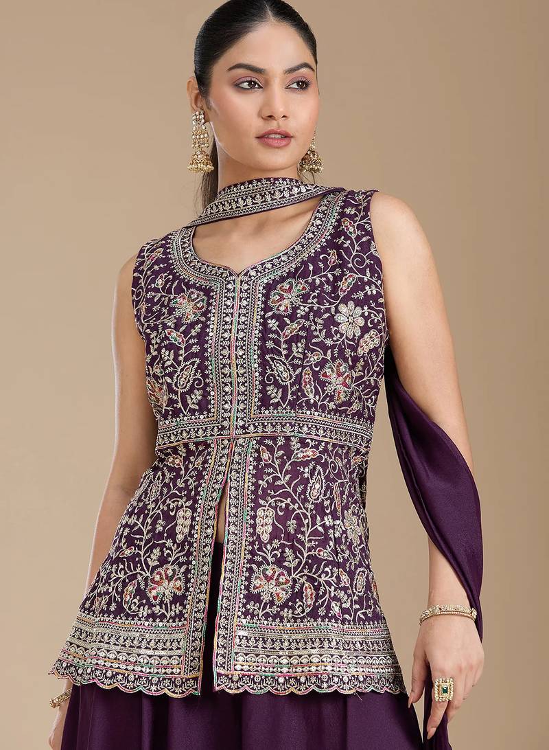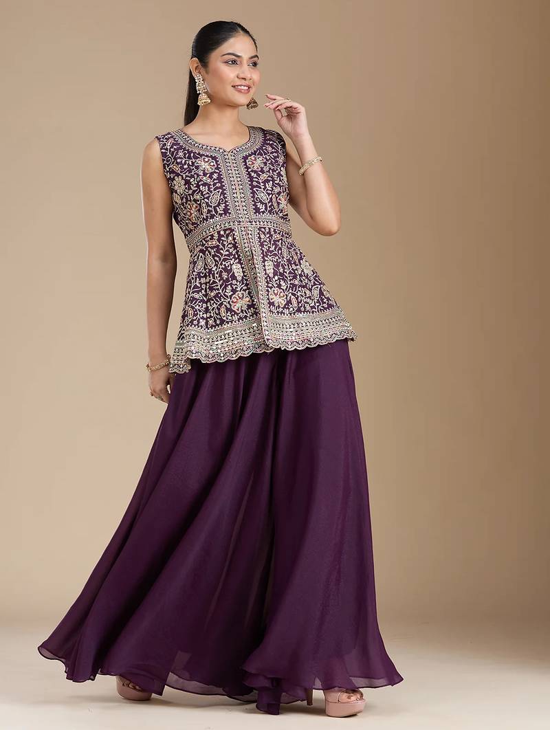 | Product Name | Wine Color Star Georgette Party Wear Designer Peplum Sharara Set | |
