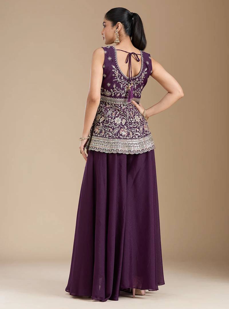 Wine color star georgette party wear designer peplum sharara set stitched