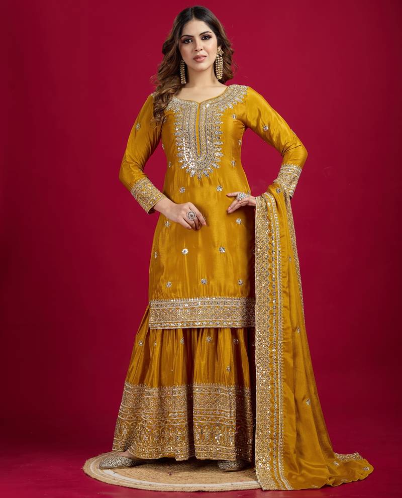 Yellow chinnon silk embroidery work sharara set stitched