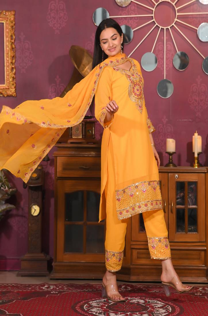 | Product Name | Yellow Colour Faux Georgette Silk Heavy Embroidery Work Fully Stitched Salwar Suit | |
