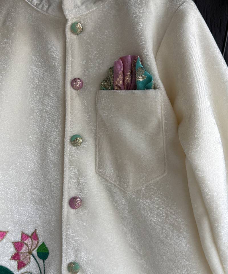 | Product Description | Beautiful Off White Velvet Kurta With Mandarin Collar, Kurta With Side Slits Having Placement Thread Emb On The Right Side Panel.Kurta With Pocket And Pocket Square.Kurta With Fabric Covered Buttons .Pyjama With Half Band And Half Elastic.
