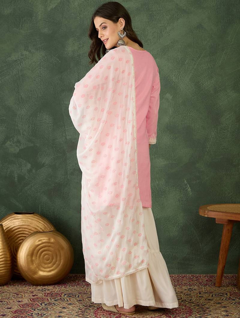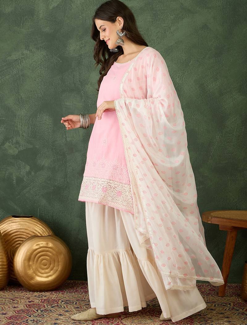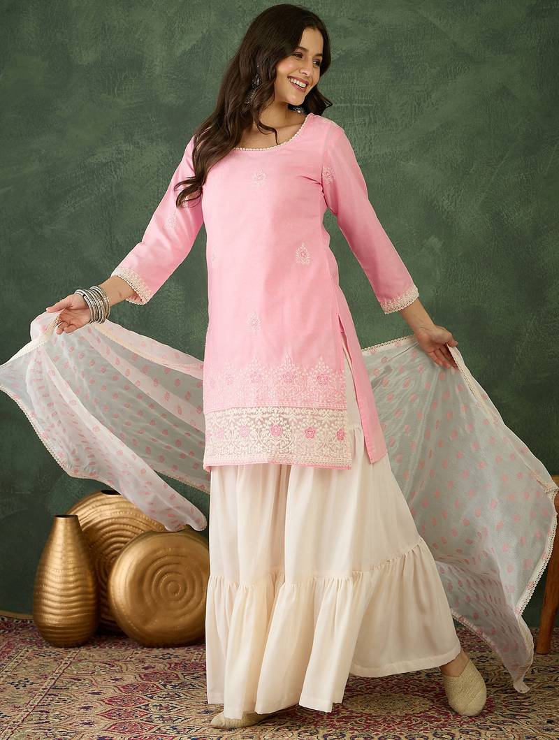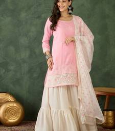 Women's embroidery work cotton satin fabric straight kurta sharara and dupatta set