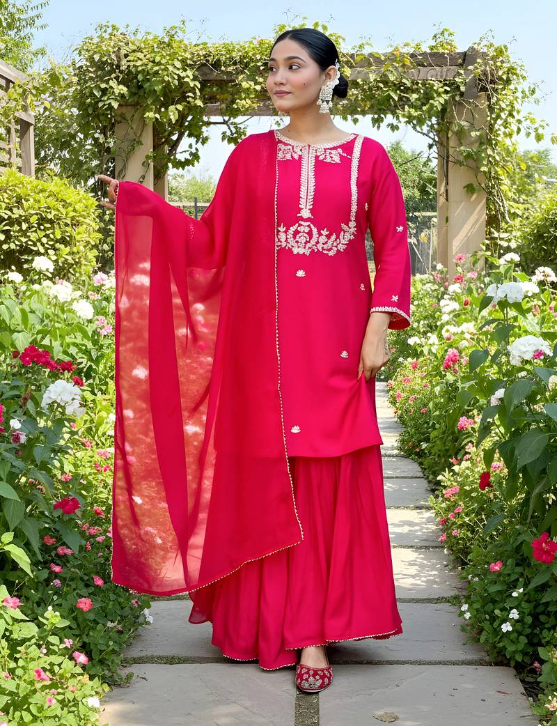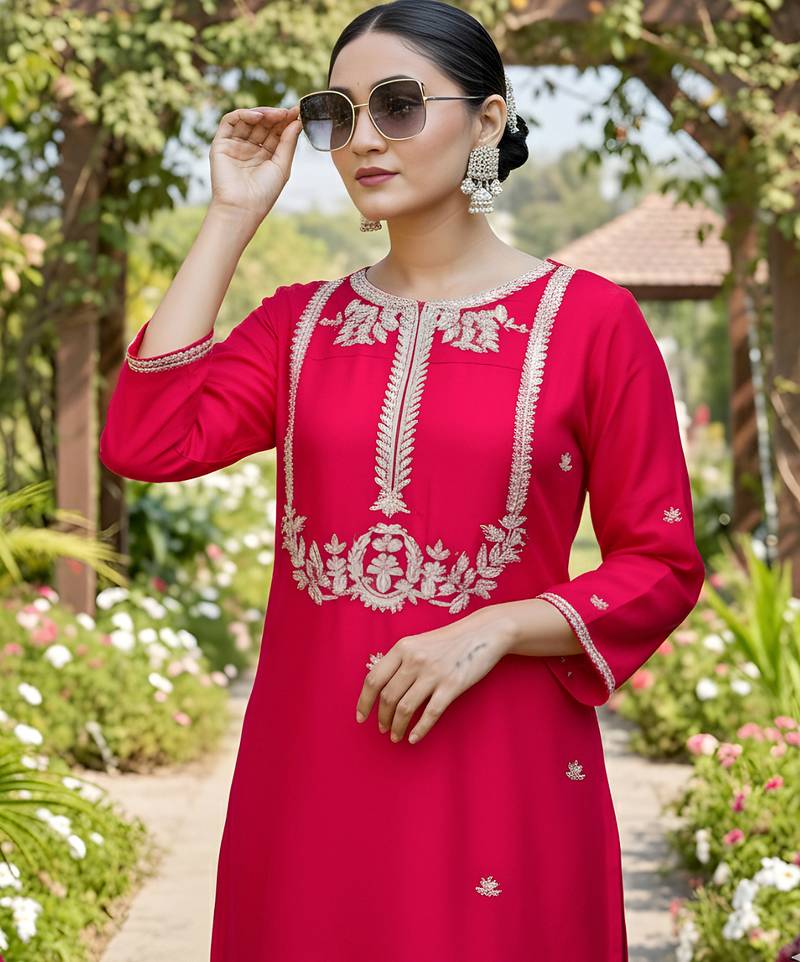 | Product Name | Women's Embroidery Work Viscose Silk Fabric Straight Kurta Palazzo And Dupatta Set | |