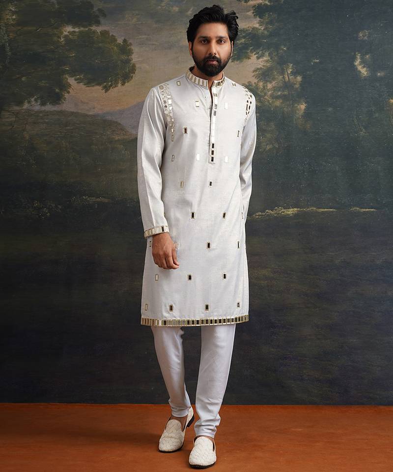 | Product Description | A Graceful Ensemble That Balances Subtle Tones With Intricate Craftsmanship. This Ice Grey Kurta Set Is Beautifully Crafted From Premium Fabric And Adorned With Full Hand Embroidery And Mirror Work In Gold Accents, Creating A Sophisticated And Radiant Look. Perfect For Festive Occasions, Receptions, Or Elegant Gatherings, This Set Brings Refined Artistry And Contemporary Style Together In Effortless Harmony.