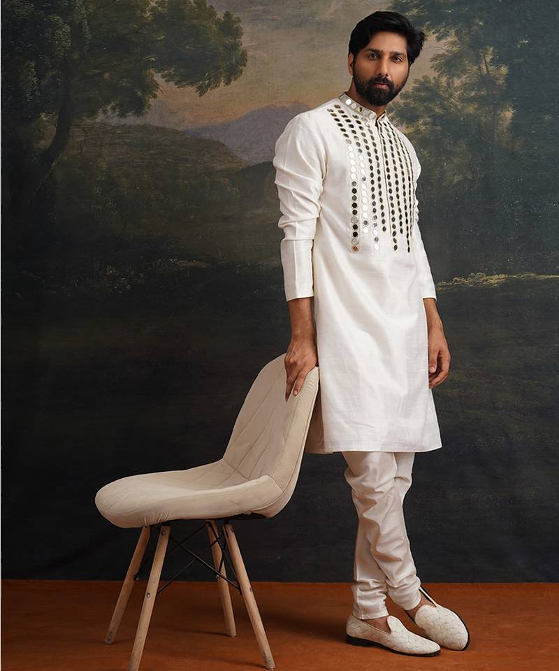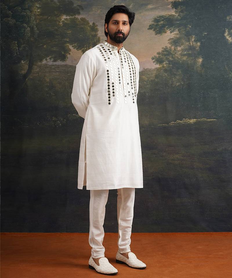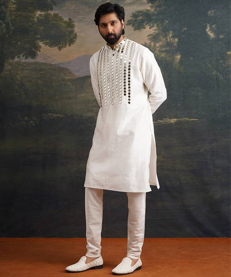 | Product Description | A Timeless Ensemble That Celebrates Elegance And Craftsmanship. This Ivory Kurta Set Is Crafted From Premium Fabric And Adorned With Delicate Hand Embroidery And Mirror Work, Giving It A Soft Shimmer And Graceful Appeal. Paired With Matching Pants, This Set Is Perfect For Festive Celebrations, Cultural Events, Or Refined Daytime Gatherings Where Understated Beauty Meets Artisanal Detail.