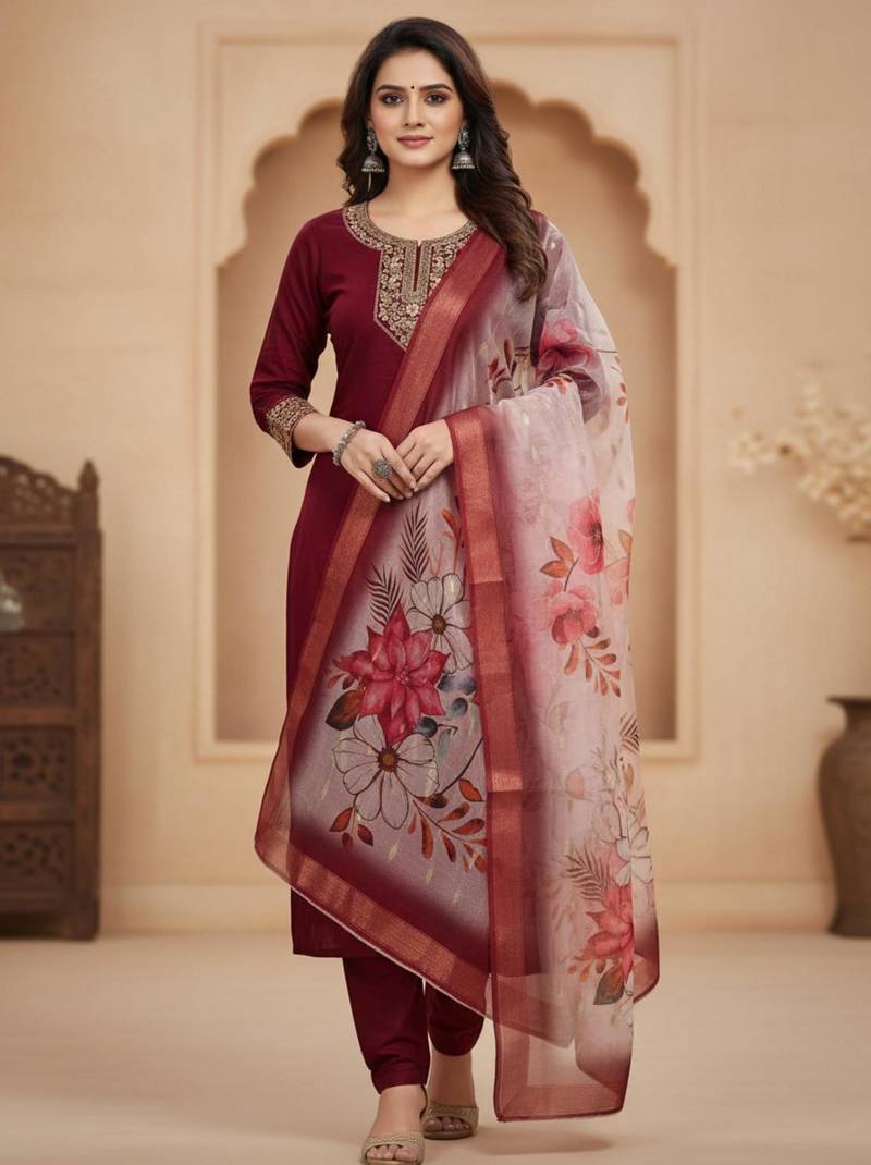 Maroon coding sequence embroidered kurta with trouser & dupatta stitched