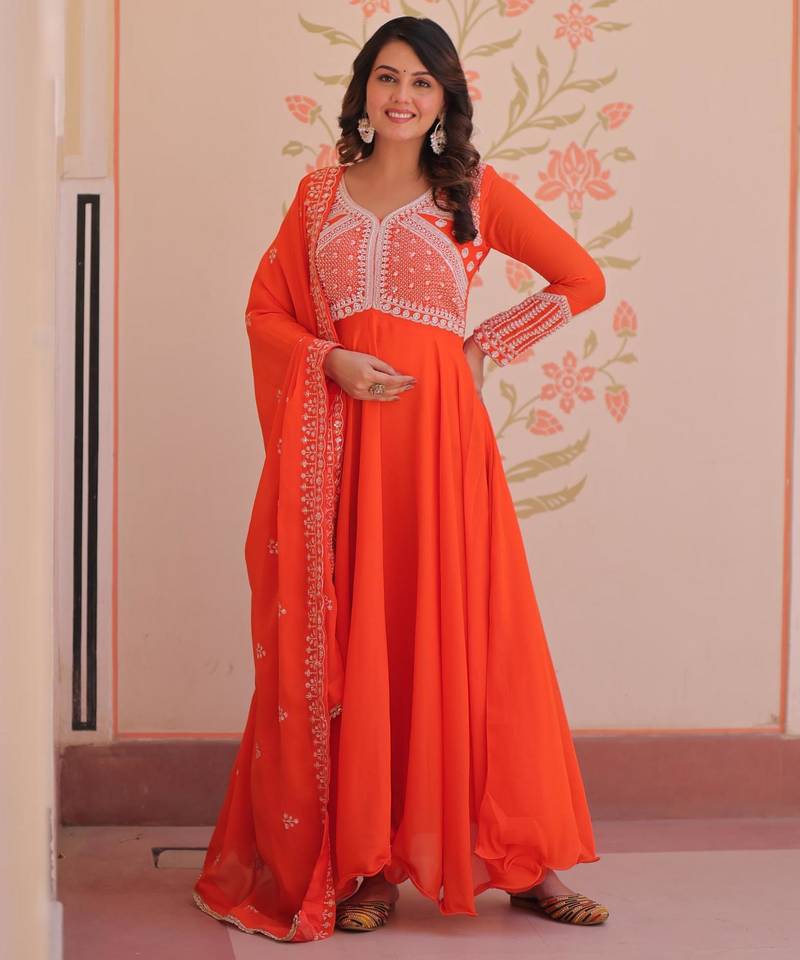 | Product Name | Orange Star Georgette Rich Sequins And Beads Embroidery Flared Gown With Heavy Dupatta | |