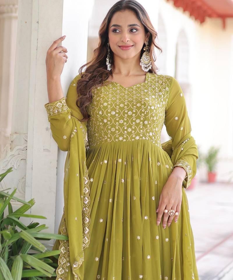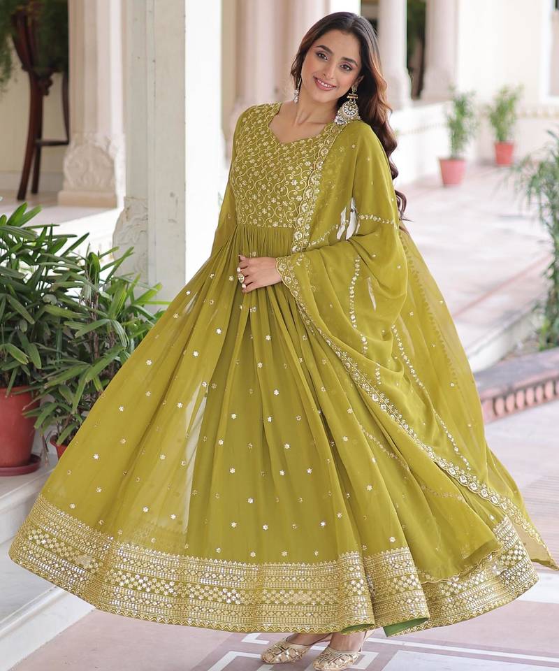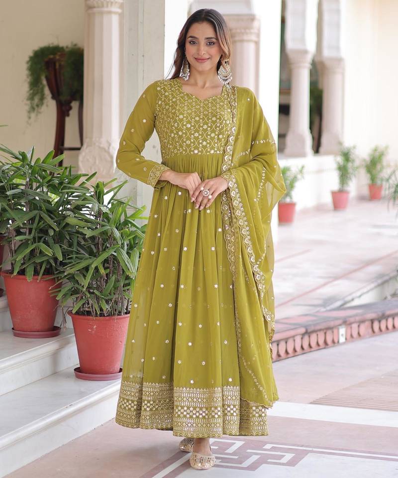 | Product Name | Parrot Faux Georgette Sequins & Zari Embroidered Flared Gown With Heavy Dupatta | |