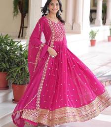 Pink faux georgette sequins & zari embroidered flared gown with heavy dupatta stitched