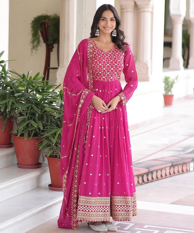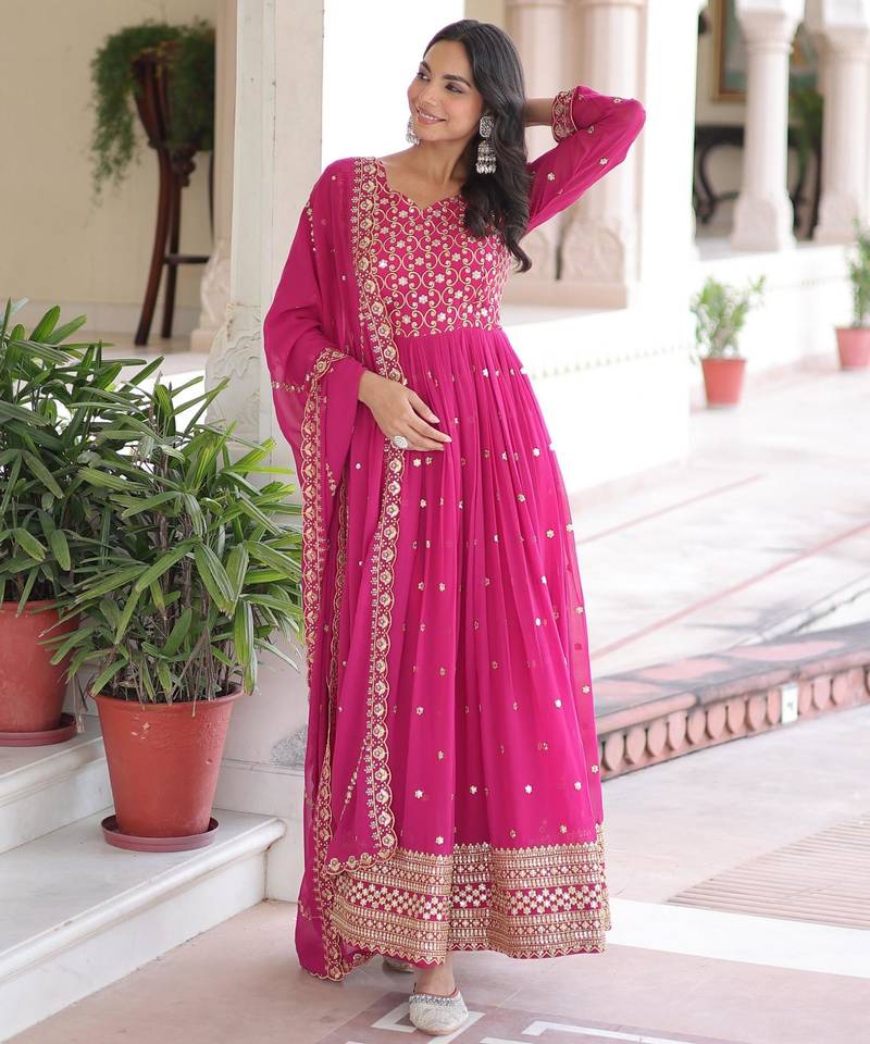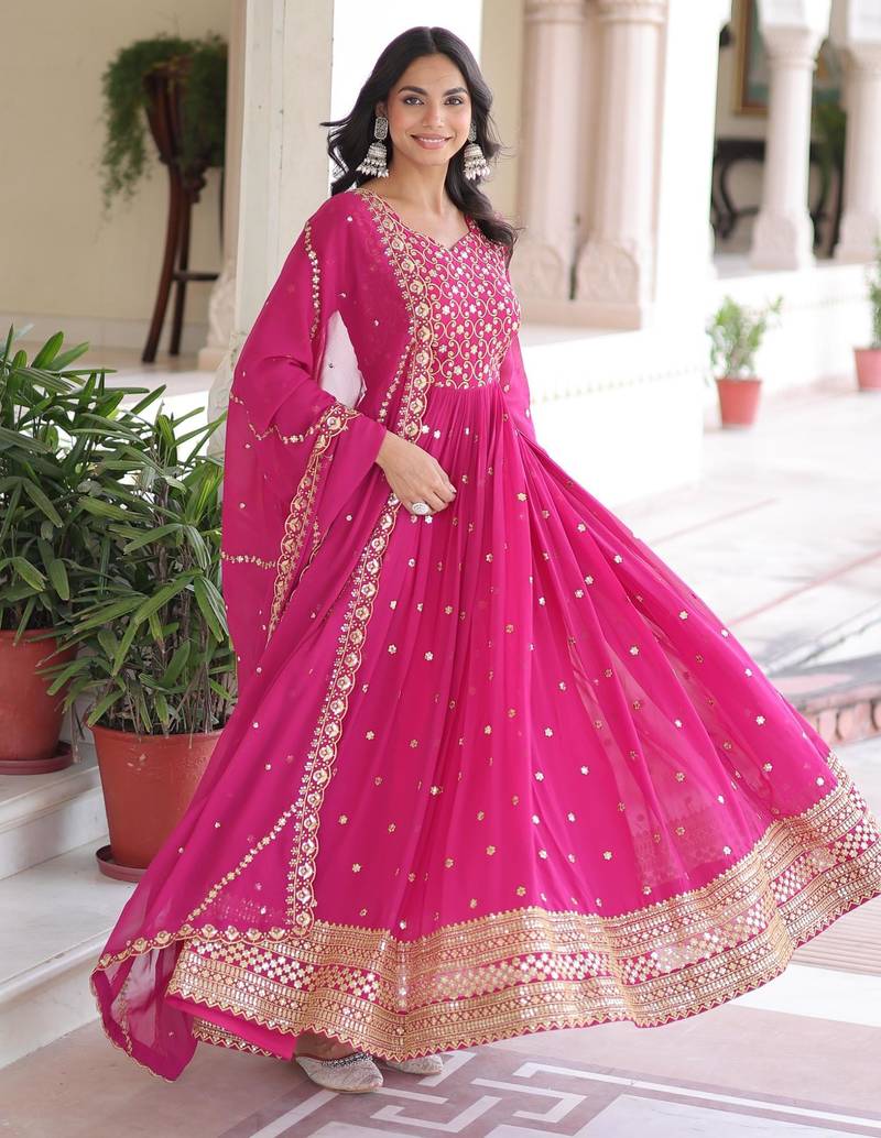 Product Name Pink Faux Georgette Sequins & Zari Embroidered Flared Gown With Heavy Dupatta