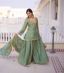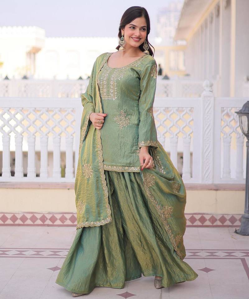 | Product Description | Green Silk Sharara Set Featuring A Zari And Sequins Embroidered Kurta, Paired With A Matching Silk Sharara And Dupatta. Crafted In Rich Silk Fabric, This Sharara Set Offers A Smooth Drape With Detailed Embroidery That Adds A Subtle Festive Touch. Suitable For Festive Occasions, Traditional Functions, And Special Gatherings. |